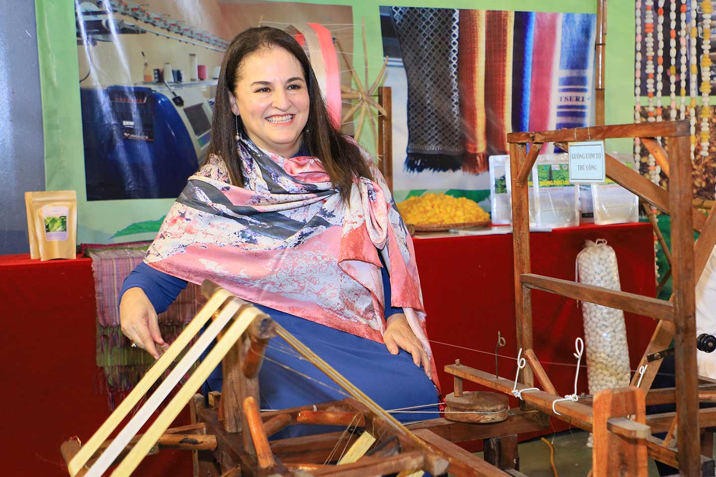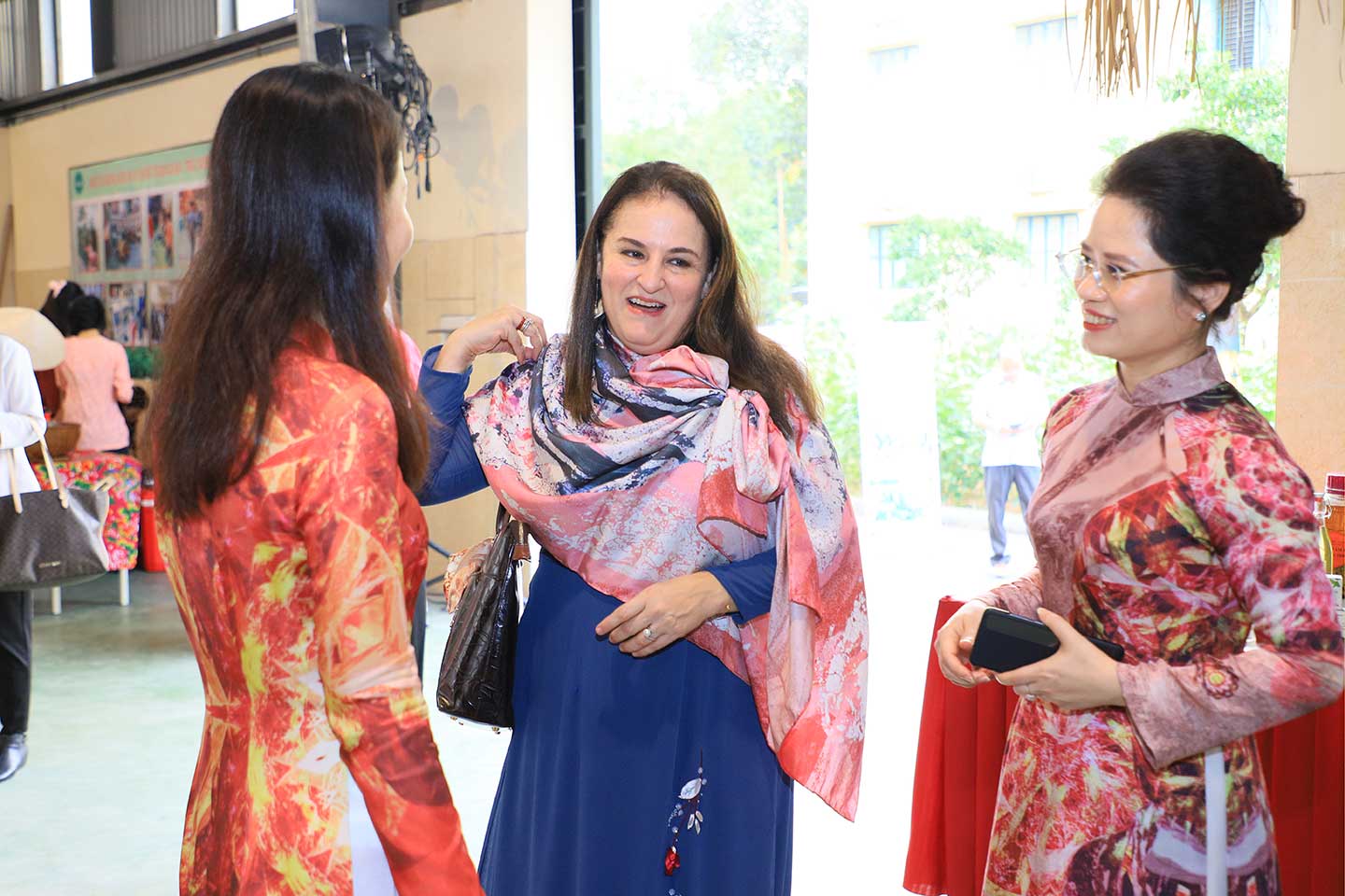 Trưởng đại diện UN Women tại Việt Nam Elisa Fernandez quàng chiếc khăn dài Sơn mài Khảm trứng hồng