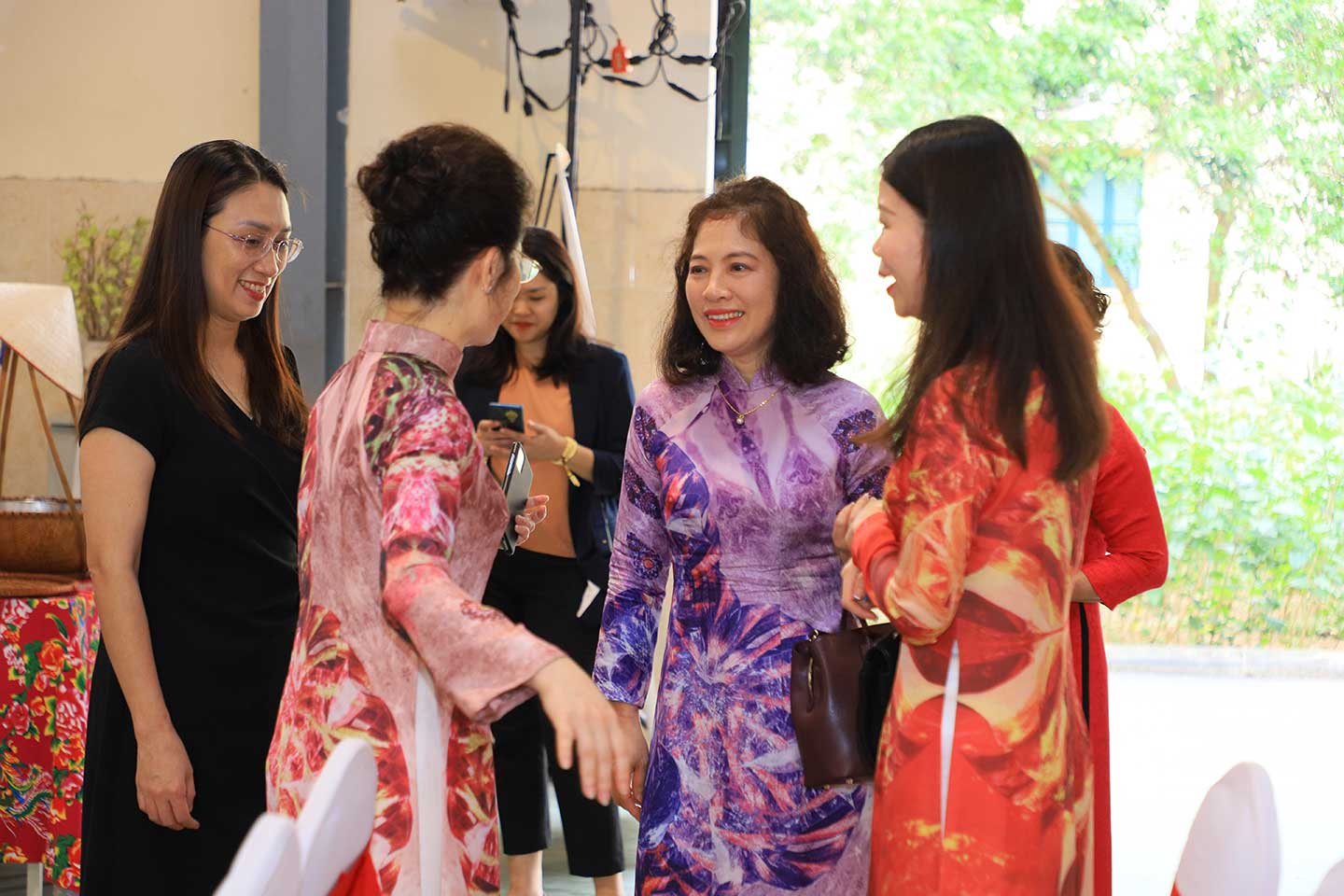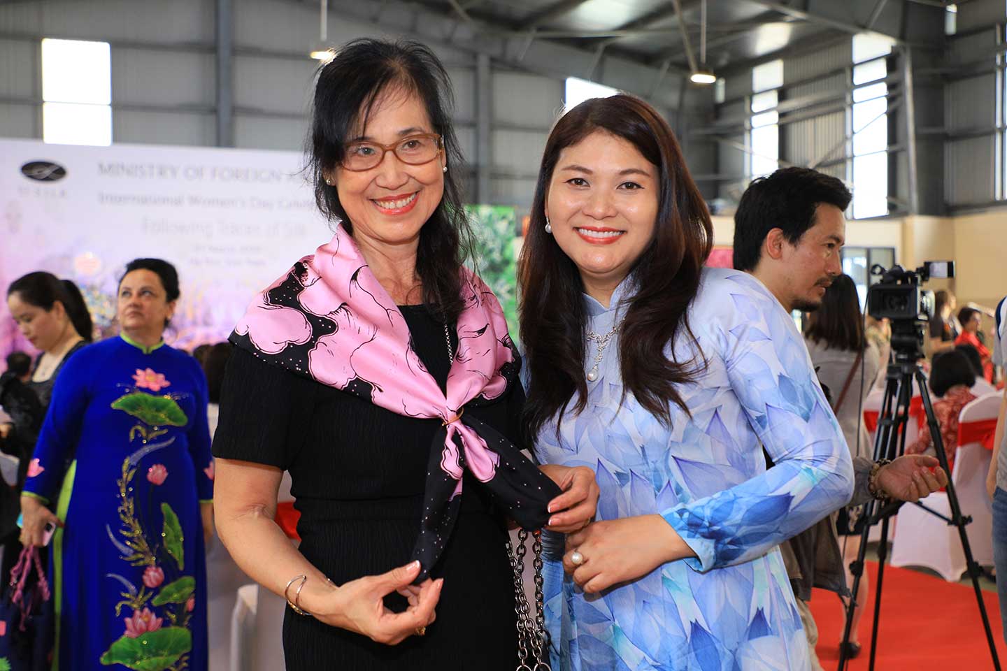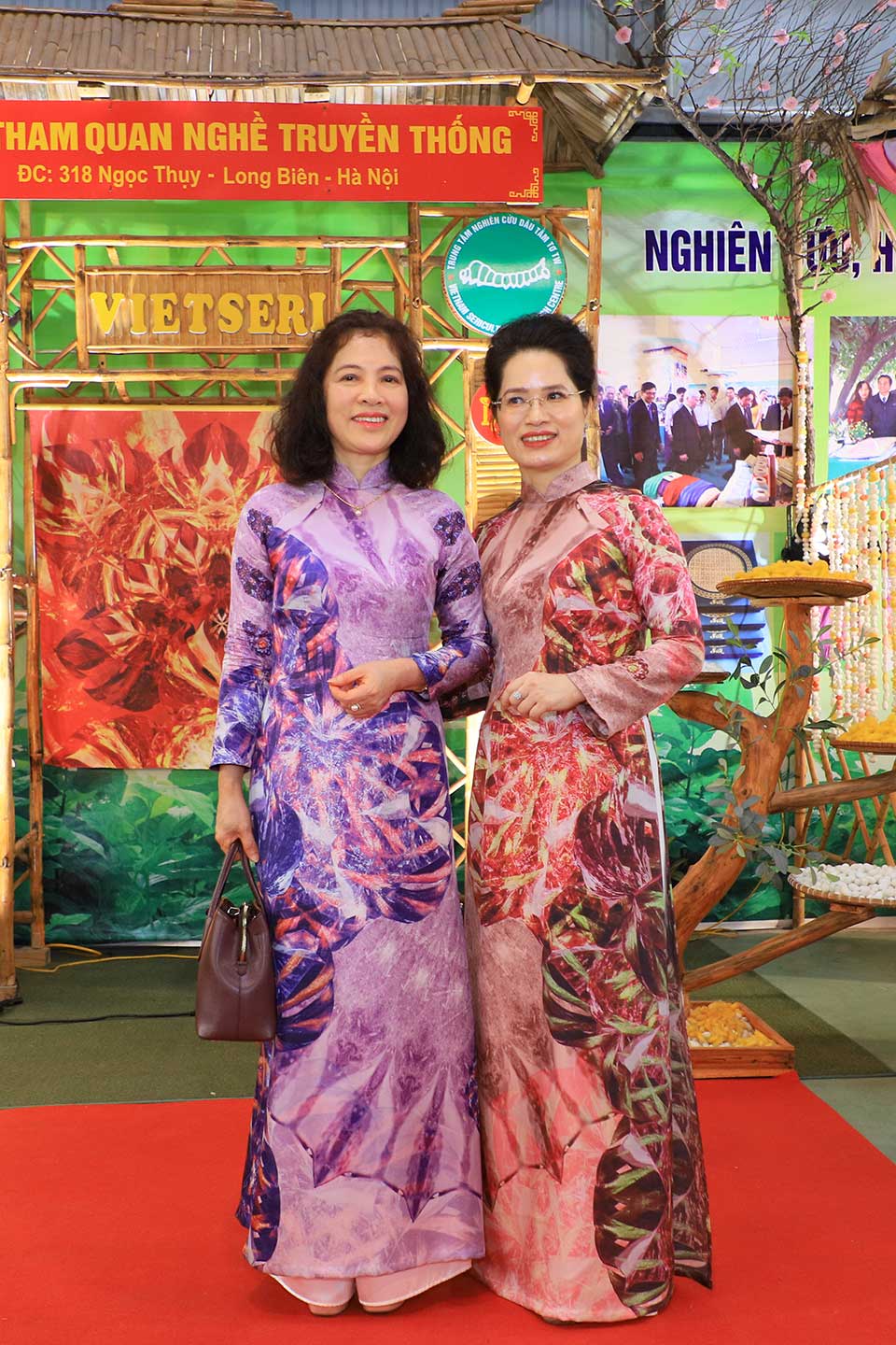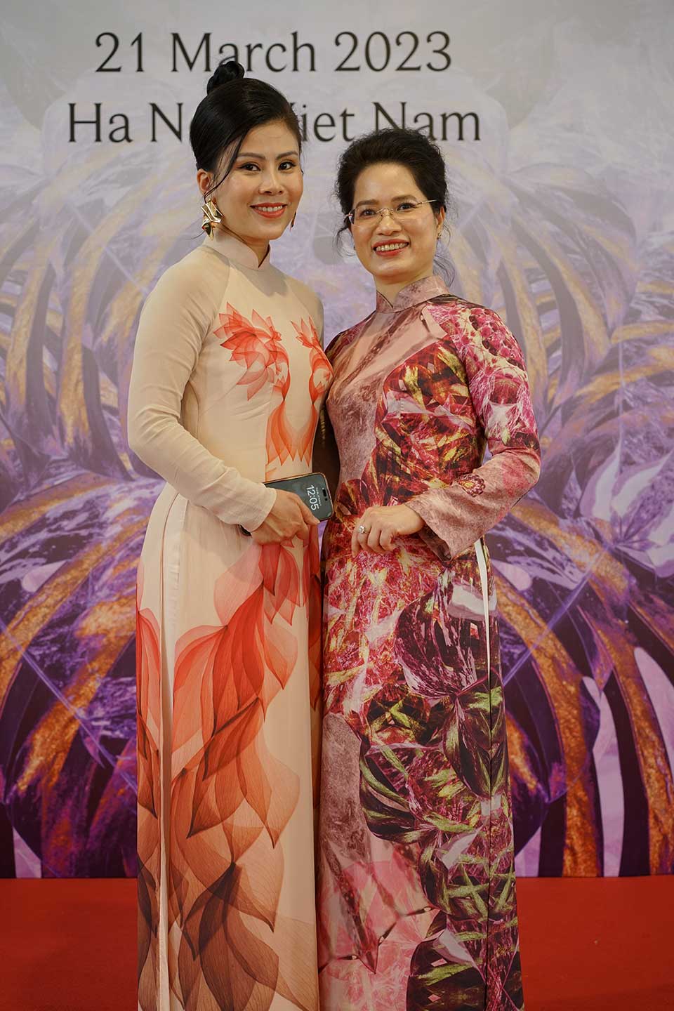 Doanh nhân Bùi Tú Ngọc (trái) quàng khăn cá Koi tím hồng và Doanh nhân Ngô Thị Thu Hương với chiếc áo dài hoạ tiết Hoa sen tím