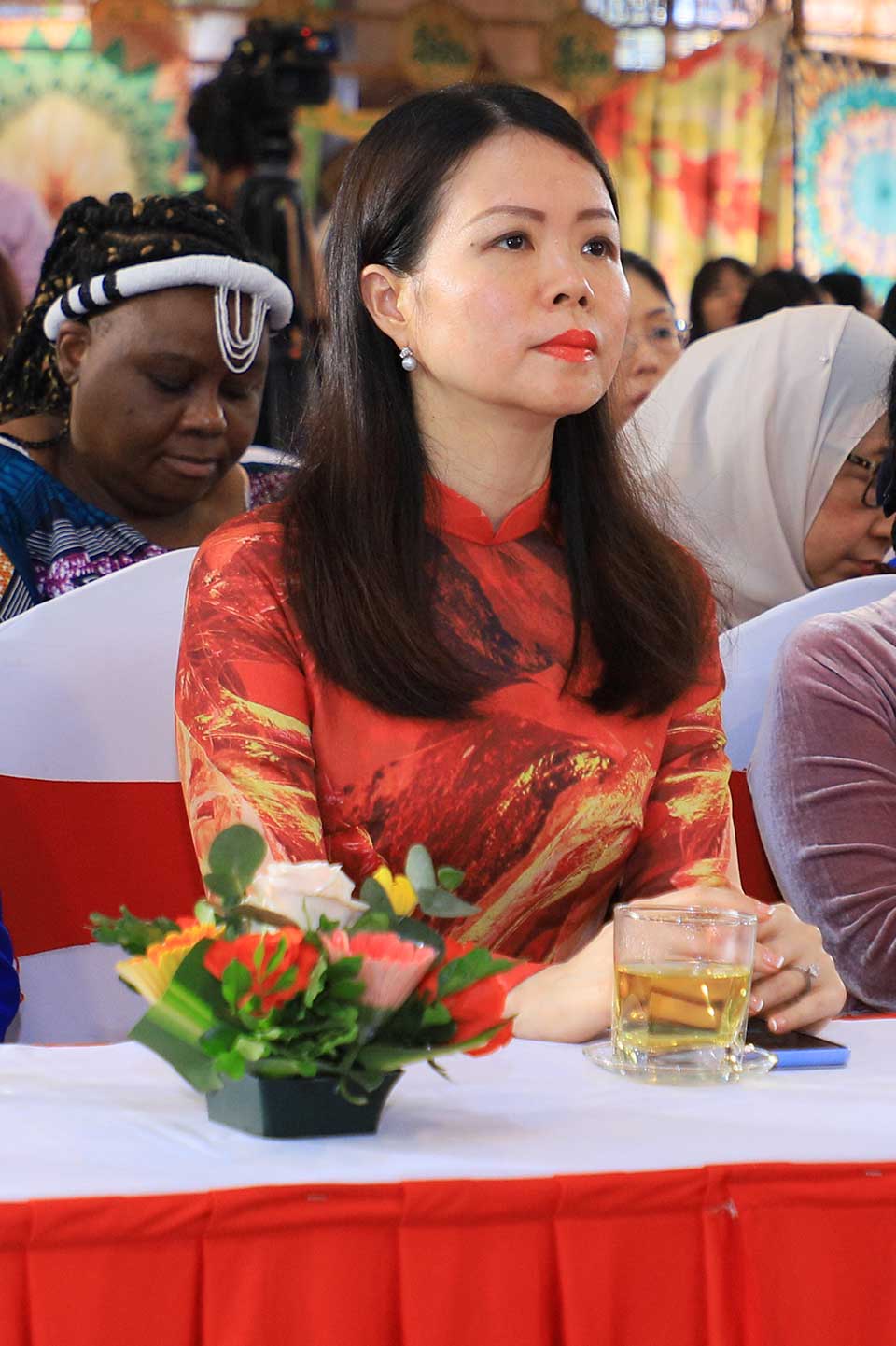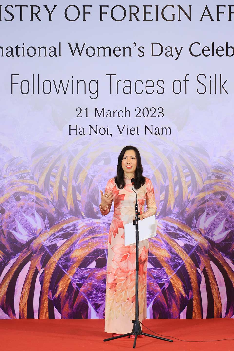 Thứ trưởng Ngoại giao Lê Thị Thu Hằng mặc chiếc áo dài hoạ tiết Hoa Sen đỏ