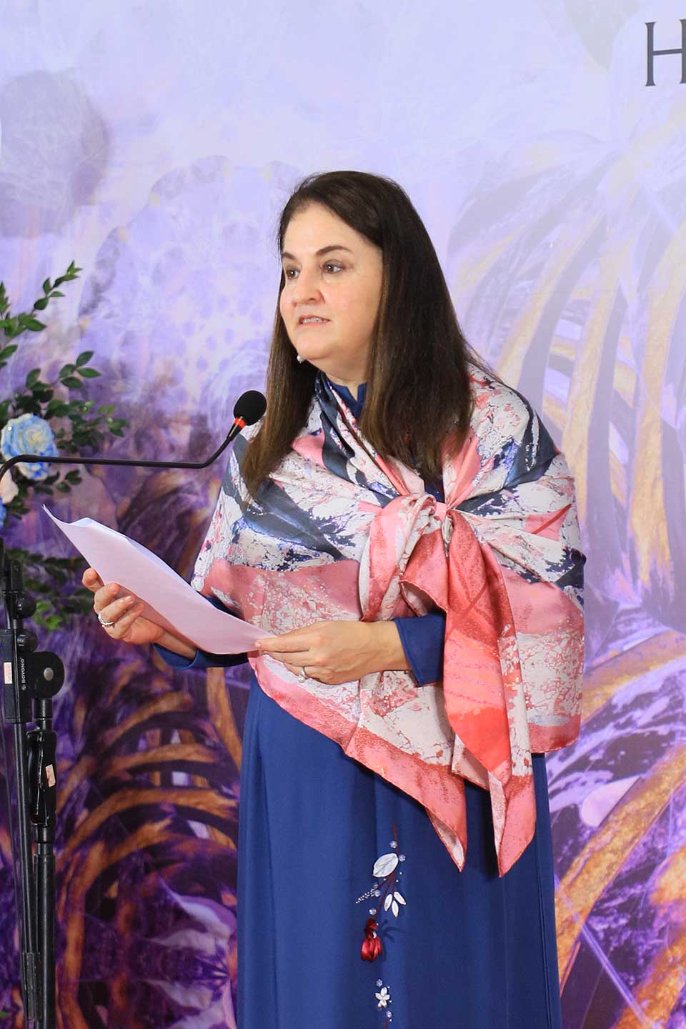 Phu nhân Bộ trưởng Ngoại giao, Chủ tịch danh dự Nhóm AWCH Vũ Thị Bích Ngọc mặc chiếc áo dài hoạ tiết Chòm sao tím